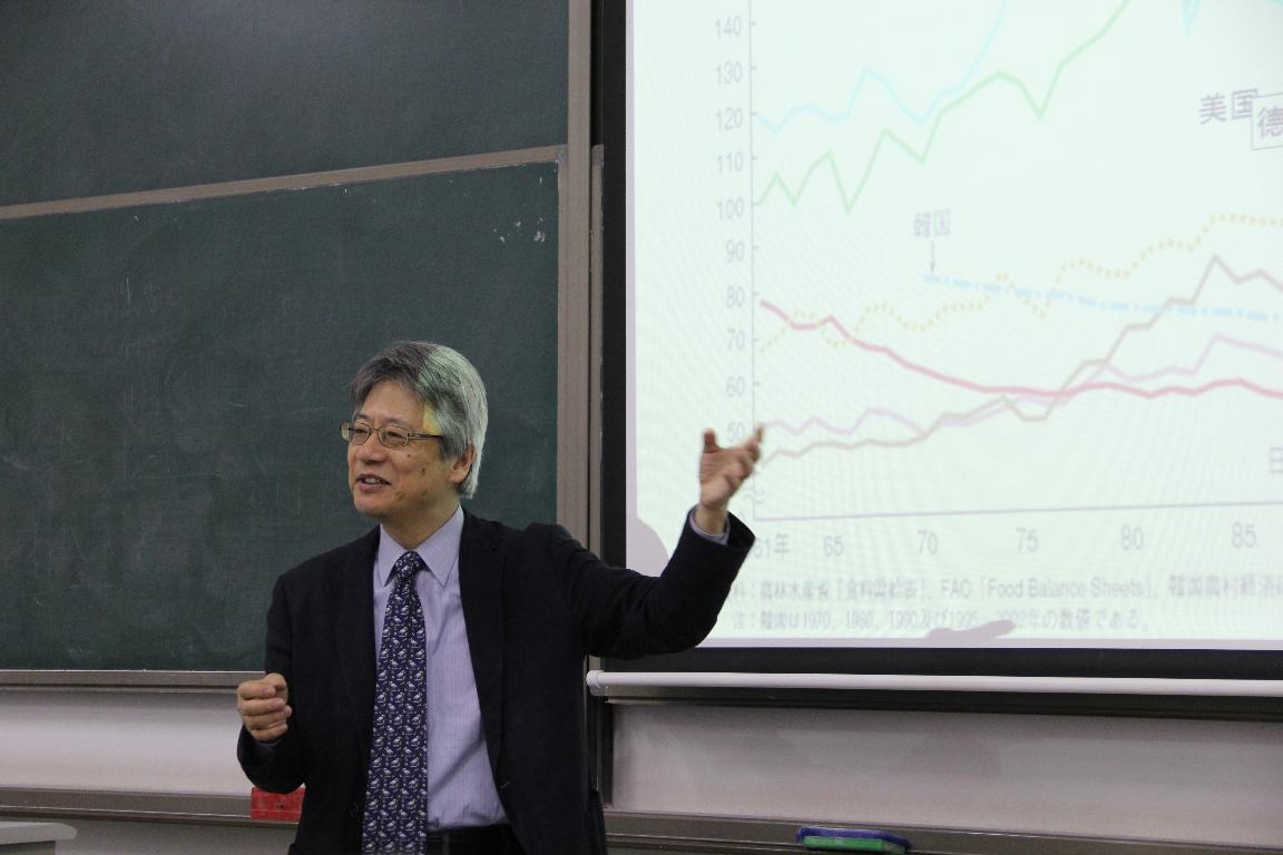 後藤教授首先介绍了日本粮食自给率的现状。按照热量计算,日本粮食自给率始终徘徊在39%,在包括美国、德国和英国等的全球主要经济体中位列最低。对于日本粮食自给率持续低迷的原因,後藤教授通过图表展示了日本粮食在1985年广场协议前后的产量变化,然后以大米生产为例,从大米生产的承担者、大米种植补贴政策、关税及贸易总协定等角度,揭示了日本高度经济增长时期工农业发展的差距以及为解决差距采取的对策。这些对策一方面造成了日本大米过剩的局面,另一方面是粮食自给率的不断下滑。最后,後藤教授以武藏大学所在的东京练马区的都市农业为例,简要介绍了日本都市农业的发展现状以及存在的意义与价值。