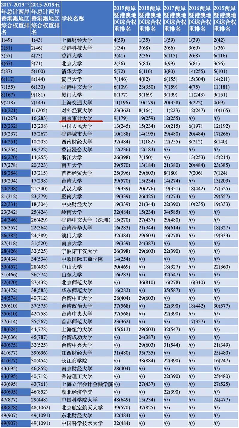 两岸暨港澳地区高校经济学研究力综合权重排名情况
