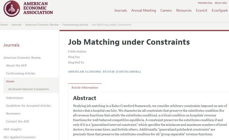 今年5月,yd222云顶线路检测孙宁教授、俞宁教授与斯坦福大学Fuhito Kojima教授合作撰写的市场设计理论论文《Job Matching under Constraints(约束下的工作匹配)》发表于《American Economic Review》,三人为共同第一作者。