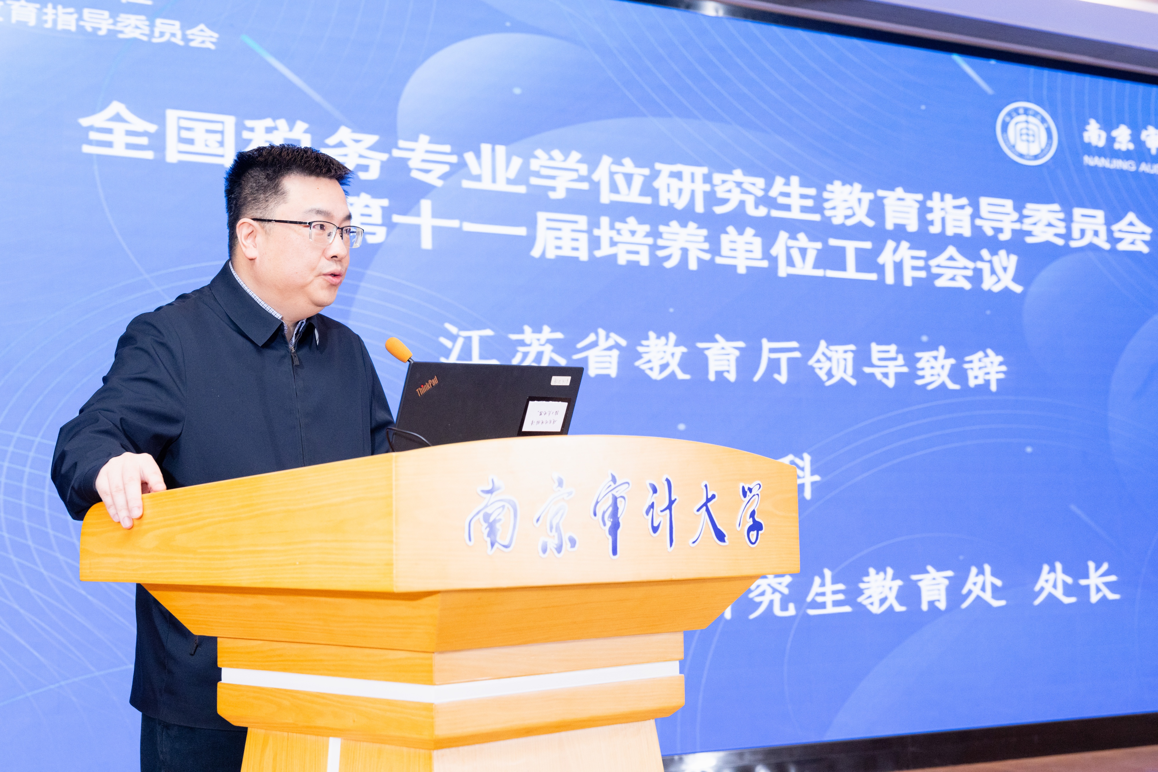 江苏省教育厅研究生教育处处长金科致辞。他通过介绍江苏高校的发展现状及全国排名,强调江苏省研究生教育的三大特色:规模大、学科水平高、专业和学科覆盖面广。他指出江苏省研究生教育以立德树人、服务需求、提高质量、追求卓越为主线,坚持系统思维和底线思维,走内涵式发展道路。他呼吁与会专家共同探讨研究生教育转型趋势,积极探索符合专业研究生教育发展规律和培养制度的发展模式,不断增强研究生的创新能力和韧性。