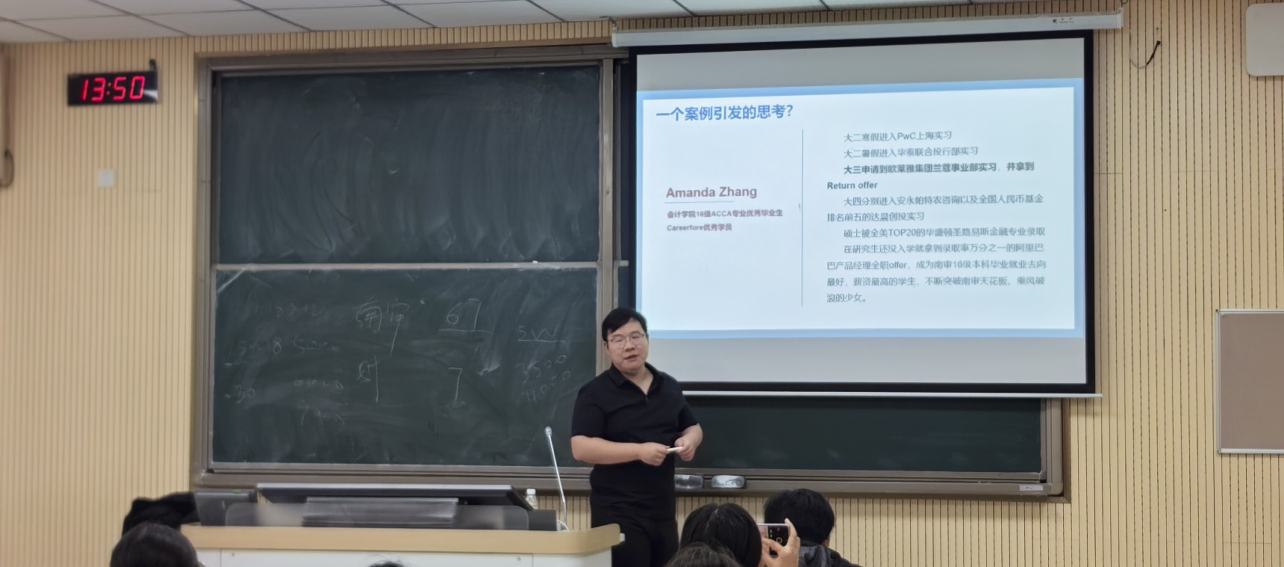 首先,吴政霖员工以五位南审优秀毕业生的成功案例为切入,阐述了南审平台的独特性与职业规划的重要性;其次,他从提前获取信息、迎合社会需求及提升思想觉悟等方面对经济学专业员工如何成功规划老员工活给出了具体建议;最后,他以一份南审优秀毕业生的简历内容为例,向同学们指出优异学业成绩、高质量实习和科学研究基础等要素,均可能成为未来求职过程中的重要亮点。在讲座过程中,吴政霖员工就同学们在经济学专业就业选择中的实际问题,进行了热烈而又亲切的交流指导。